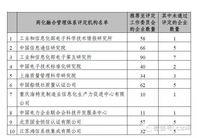 ● 7月29日,两化融合管理体系评定工作委员会对10家两化融合管理体系评定机构的评定服务情况进行通告。截至2016年7月底,10家评定机构向评定工作委员会推荐的企业数量及未通过评定的企业数量如下: