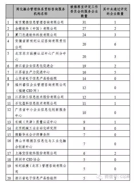 ● 7月29日,两化融合管理体系评定工作委员会对两化融合管理体系贯标咨询服务机构的服务情况进行通告。截至2016年7月底,被推荐至评定工作委员会的企业相关的咨询服务机构共计80余家,其中,服务5家以上被推荐企业的咨询服务机构共计20家,所服务企业通过评定情况如下: