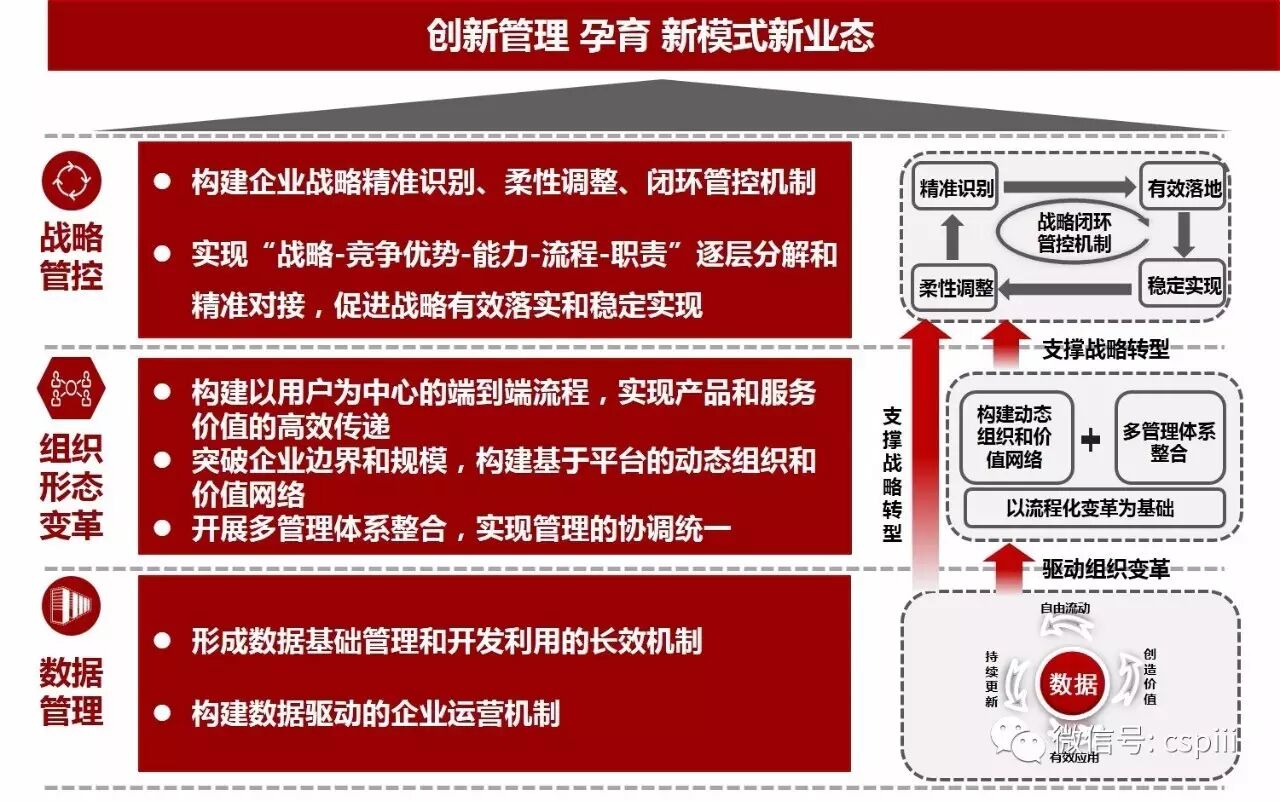 互联网时代,快速满足客户个性化、多样化需求成为企业发展的根本目标,创新驱动、跨界融合、组织重构、以人为本、互联互通逐渐成为企业转型发展的重要方向。为适应互联网时代发展需求,企业亟需变革传统工业时代的管理模式,开展战略的柔性调整和闭环管控,构建动态组织和价值网络,开创完备的数据治理体系,系统创新互联网时代企业管理制度、机制及模式,以孕育形成互联网时代的新模式新业态,实现可持续发展。两化融合管理体系是引导企业强化变革管理、系统推进两化融合的管理方法论,两化融合管理体系贯标是互联网时代企业管理创新的重要引导和有效途径。企业可按照该标准要求,围绕互联网时代新型能力的识别、打造和动态调整,建立和完善战略管控、流程与组织变革以及数据治理等方面的机制,为生产方式和服务模式变革创造有力条件。 一、互联网时代的企业战略管控 以互联网为代表的新一代信息技术持续创新,并加速与制造领域全面融合,企业内外部环境瞬息万变。为紧跟时代发展需求,明确企业时代定位,实现可持续发展,体现企业发展使命、经营思想、价值体系和行为准则等的战略理念和战略目标在发生着快速、深刻的变革。从管理的角度,加强互联网时代的战略管控,围绕战略的精准识别、柔性调整、有效落实和稳定实现进行管理创新,是互联网时代管理变革的重中之重。两化融合管理体系提出的战略循环管控机制,可作为企业围绕战略管控进行管理创新的方法指导。 1. 构建企业战略精准识别、柔性调整、闭环管控机制 随着信息技术快速发展,用户需求日益多样,市场竞争日趋激烈,关键竞争要素正在发生快速的变化,企业能否准确定位符合互联网时代要求的发展战略,并推动其与时俱进,对于企业能否实现可持续发展具有决定性作用。企业如果没有清晰的发展战略,或者其发展战略按部就班、因循守旧,过于关注和依赖传统竞争要素,那么不管如何努力,都终将会被新生力量取代。面临复杂多变的动态环境,企业需要构建战略精准识别、柔性调整、闭环管控的机制,必要时,需设立由高管、业务负责人以及外部专家组成的专门机构对战略进行研究、制修定、审核及执行跟踪。企业需应用信息技术创新战略管控手段,及时跟踪、全面采集和深入分析宏观经济政策、市场情况、竞争对手情况、合作方情况、内部发展等信息,精准定位企业发展战略和目标。在战略贯彻落实过程中,企业需实时跟踪、及时感知内外部发展环境的变化,并结合既有战略的执行情况,作出灵活响应,对发展战略进行滚动修订和优化调整,实现企业战略的闭环控制。 2. 实现“战略-竞争优势-能力-流程-职责”逐层分解和精准对接,促进战略有效落实和稳定实现 企业识别并确立适宜的发展战略后,只有建立起有效的战略落地机制并使其有序运行,才能确保战略目标的有效实现。战略体现了企业发展的总体价值取向,而企业所有价值的产生最终均需通过业务流程及其各环节的业务工作来实现,在相关业务流程及其业务环节完整一致地贯彻企业战略目标,是战略有效落地的最终保证。同时,为避免企业底层业务流程与顶层战略之间的脱节和偏离,需首先将战略转化为企业外部竞争中的可持续竞争优势需求,进而转化内部一系列新型能力的打造需求,再通过能力相关业务活动的流程及职责优化安排来实现能力。可以说新型能力的打造是战略落地的有效路径,能够帮助完成战略与流程之间的精准对接,确保战略的有效落地和稳定实现。因此,企业需建立“战略-竞争优势-能力-流程-职责”的战略逐层分解和精准对接机制,以新型能力打造为手段和路径,以流程管理和职责设置为落脚点,充分调动、整合、协调相关资源,确保战略落地。 专栏1:鲁泰纺织的企业战略管控实践 鲁泰纺织股份有限公司是全球最具规模的高档色织面料生产商和全球顶级品牌衬衫制造商。鲁泰纺织致力于“全面国际化”的战略方向,搭建了由战略委员会、战略管理部、各业务部门战略信息分析员组成的“高层-中层-基层”战略管控组织架构,构建了一套包括战略信息收集与分析、战略制定、战略部署、战略跟踪与调整在内的战略闭环管控机制,并在公司战略管理系统中进行了固化。 鲁泰开展了常态化的战略信息收集与分析。在战略管理部的的统一安排下,各部门战略分析员收集包括政策法律、社会文化、经济环境、科技环境、供应商、顾客、行业竞争态势等在内的国内外市场宏观环境与行业状况信息,定期报送至战略管理部,作为战略制定与调整的重要依据。 基于战略信息分析,鲁泰每年滚动制订三年战略总体发展方向及目标。战略管理部对各部门战略信息整合并进行SWOT分析、竞争对手对比分析、行业关键成功要素(KSF)分析,确定各细分业务的备选战略主题及相应经营目标值,由战略委员会进行评审与决策后,确定公司总体发展方向与目标。 根据公司总体战略与目标,战略管理部组织制定各细分市场战略规划。在此基础上,编制公司年度经营计划和部门年度及计划。企业管理部根据战略规划和年度经营计划,确定各部门绩效考核指标,确保企业战略的有效落地。 企业管理部实时跟踪各部门年度计划及目标的完成情况,由战略管理部汇总报送至战略委员会进行评估、审查。依据企业年度计