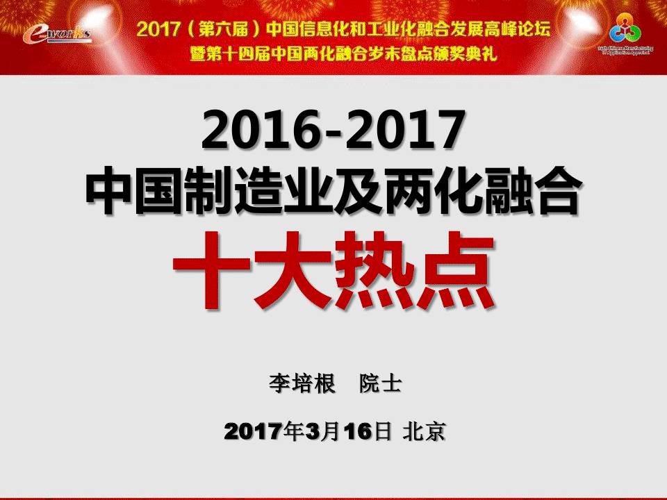 2017年3月16日,由e-works举办的主题为“互联网与工业的深度融合之道”的“2017(第六届)中国信息化和工业化融合发展高峰论坛”在北京举行。会上,李培根院士对2016-2017制造业及两化融合十大热点作了精彩解读,以下是讲稿内容。 重磅资料 2016-2017制造业及两化融合十大热点