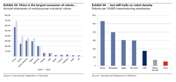 而从机器人的角度来衡量中美的自动化程度:高盛惊奇地发现,尽管中国劳动力成本低廉,但中国几乎中国最大的机器人市场,中国的机器人购买量占据了全球机器人销售总量的27%。