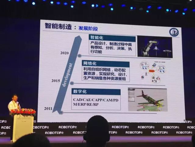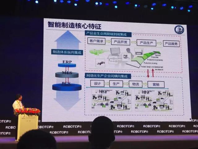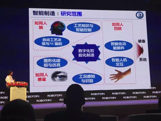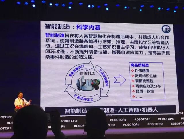 这个智能制造的概念很大。我觉得概念不大,但是内涵很重要,无非这个过程中如何把人的知识,能够积累,能够推理,并且在这个过程当中工艺知识不断积累,同时在这个过程中装备,有它自己进化能力,最后的目的我觉得还是实现高品质的制造,所以制造的行业,我永恒的主题还是高品质,高效的制造是永恒的核心,不管叫什么名字,这个是永恒的。这里面大家通过现在的信息化的手段,能够使得它这个装备的性能,有一个适应能力,同时使它工艺知识不断的积累,制造业很重要一个特点就是要长期的积累,工艺知识的积累很重要。而不是说买了几个机器人回来买了几个装备就是智能化了。那个可能差得比较远。最近我们做机器人的一个实验,现在最难做的,最困惑是工艺的膜剖(音),这里需要一个长期的积累,但是智能制造里面可能有几个核心的部分,一个就是我们讲的数字制造,一个就是载体,机器人。但这里面贯穿整个过程的还是一些人工智能的技术。