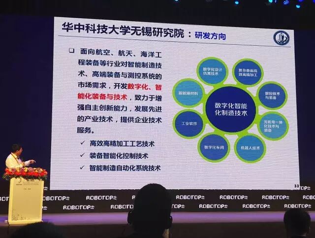 那么,这里我们虽然主要还是做三个技术,一个就是数字化技术,怎么样把工艺提高,智能化技术就是装备的智能。还有智能化车间技术,这个在江苏这一代,应该在智能制造方面确实做出了一些比较好的案例。真正把帮企业解决了一些问题。好比我们研究院在无锡研究所旁边,跟他们企业的工程人员,长时间在一起交流。那么就是你一个问题的解决,需要学校的人,也需要企业人一起工作,一起交流,通过问题驱动,把这个问题解决,一个碉堡,一个碉堡攻下来。然后真正把企业竞争力提升。我觉得这个很重要一个方向就是机器人加工,我觉得非常重要。因为大家知道这个机床,非常大。但是也非常笨重,因为机床追求精度要好。所以导轨很长,一个大型的零件加工,零件有多长,机床有多大。带来的这些问题还是非常多的。这里有一个机器人一些技术,不仔细讲了。