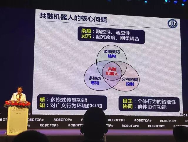 一个就是机构,有这样的顺应性,另外感知,多模态,对环境理解多认知。还有分布协调控制。这个是支持我们改变机器人发展必不可少的一部分。所以我觉得大家拼命做机器人产业的同时,也要建机器人科学中心,机器人研发的基地。离开了这样科学中心,那么你后续的发展缺乏动力,你可能会一阵子做完了以后,发现再过几年继续徘徊,再过十年还是徘徊。这样你就可能被别人拉下来,会落后。