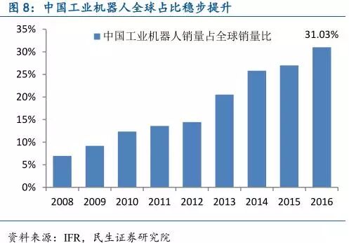 根据IFR初步统计数据,2016年我国工业机器人销量已高达9万台,较2015年增长31.28%,显著高于全球工业机器人14%的销量增速,其中中国工业机器人销量占全球销量比重以达31%,我国工业机器人的需求有了显著增长,成为全球的重要市场。