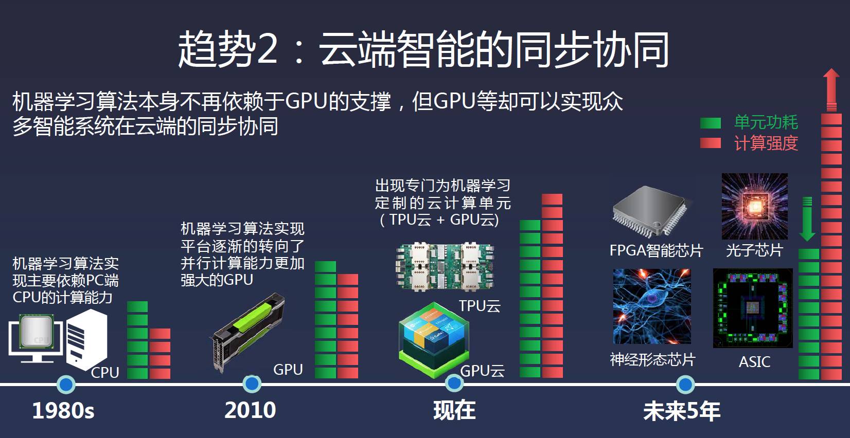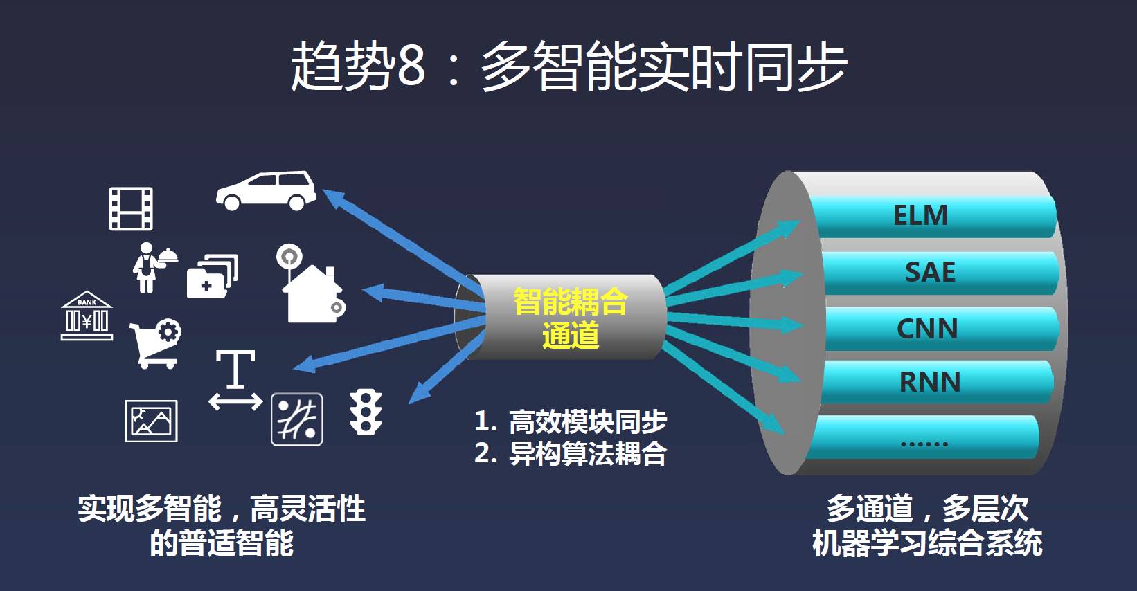 此外,演讲还介绍了人工智能和机器学习发展的历程,我们目前还在“智能”大爆发的前夜。跟传统观点相反,他认为人工智能和机器学习紧密相关、有叠加,但是不一样。他提出了目前人工智能8大趋势。并从产业和技术发展的角度,畅想了未来的发展。最后他表示:最终是智能而不是智能的载体穿越时空。