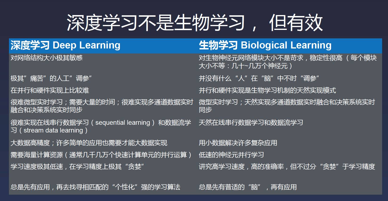 近日黄广斌教授在全球架构师峰会上发表了人工智能主题演讲《普适智能和普适学习:智能革命和智能经济的引擎》,演讲中再次提到ELM。他认为深度学习不是生物学习,并比较了深度学习、ELM和生物学习的优势劣势。